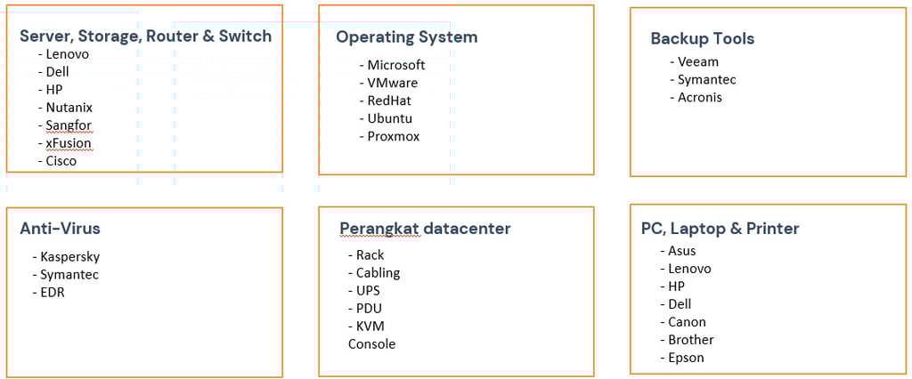 Kami menawarkan server, storage, router, switch, dan san switch dari brand terkemuka seperti Lenovo, Dell, dan Cisco.
